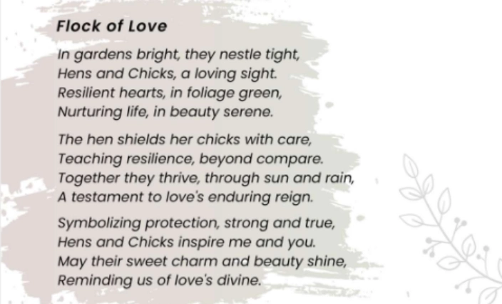 Symbolizing protection, strong and true, Hens and Chicks inspire me and you. May their sweet charm and beauty shine, Reminding us of love’s divine.