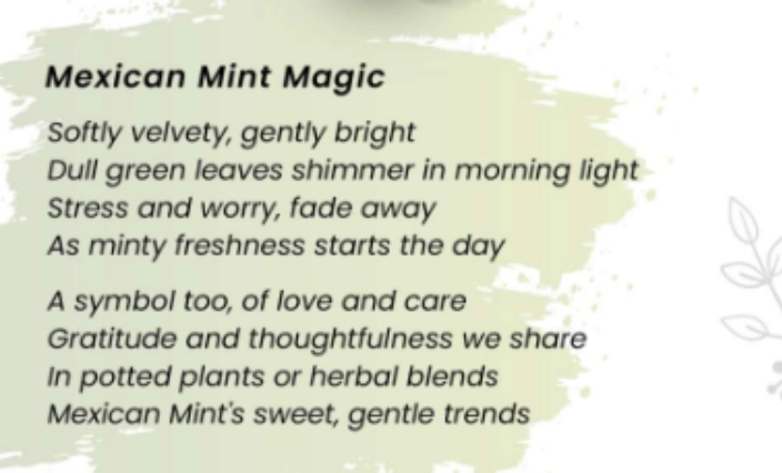 A symbol too, of love and care Gratitude and thoughtfulness we share In potted plants or herbal blends Mexican Mint’s sweet, gentle trends