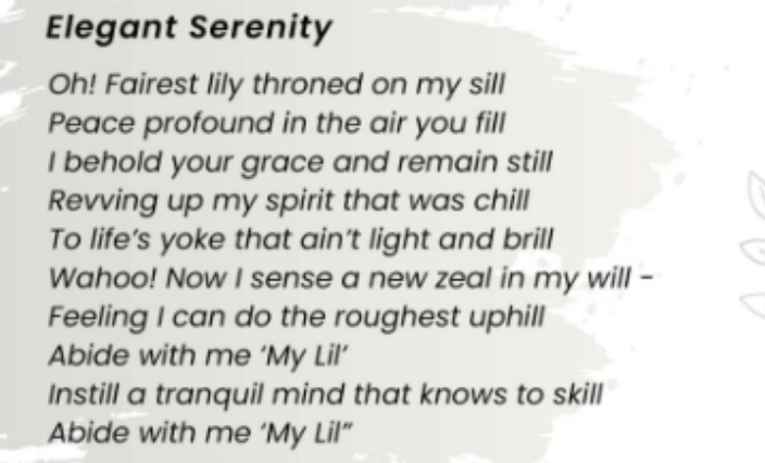 Oh! Fairest lily throned on my sill Peace profound in the air you fill I behold your grace and remain still Revving up my spirit that was chill To life’s yoke that ain’t light and brill Wahoo! Now I sense a new zeal in my will Feeling I can do the roughest uphill Abide with me ‘My Lil’