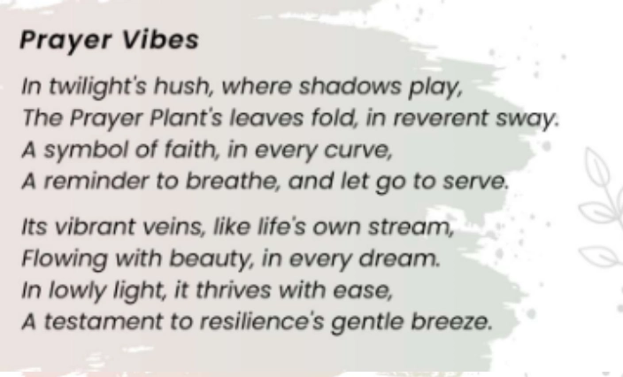 In twilight’s hush, where shadows play, The Prayer Plant’s leaves fold, in reverent sway. A symbol of faith, in every curve, A reminder to breathe, and let go to serve.
